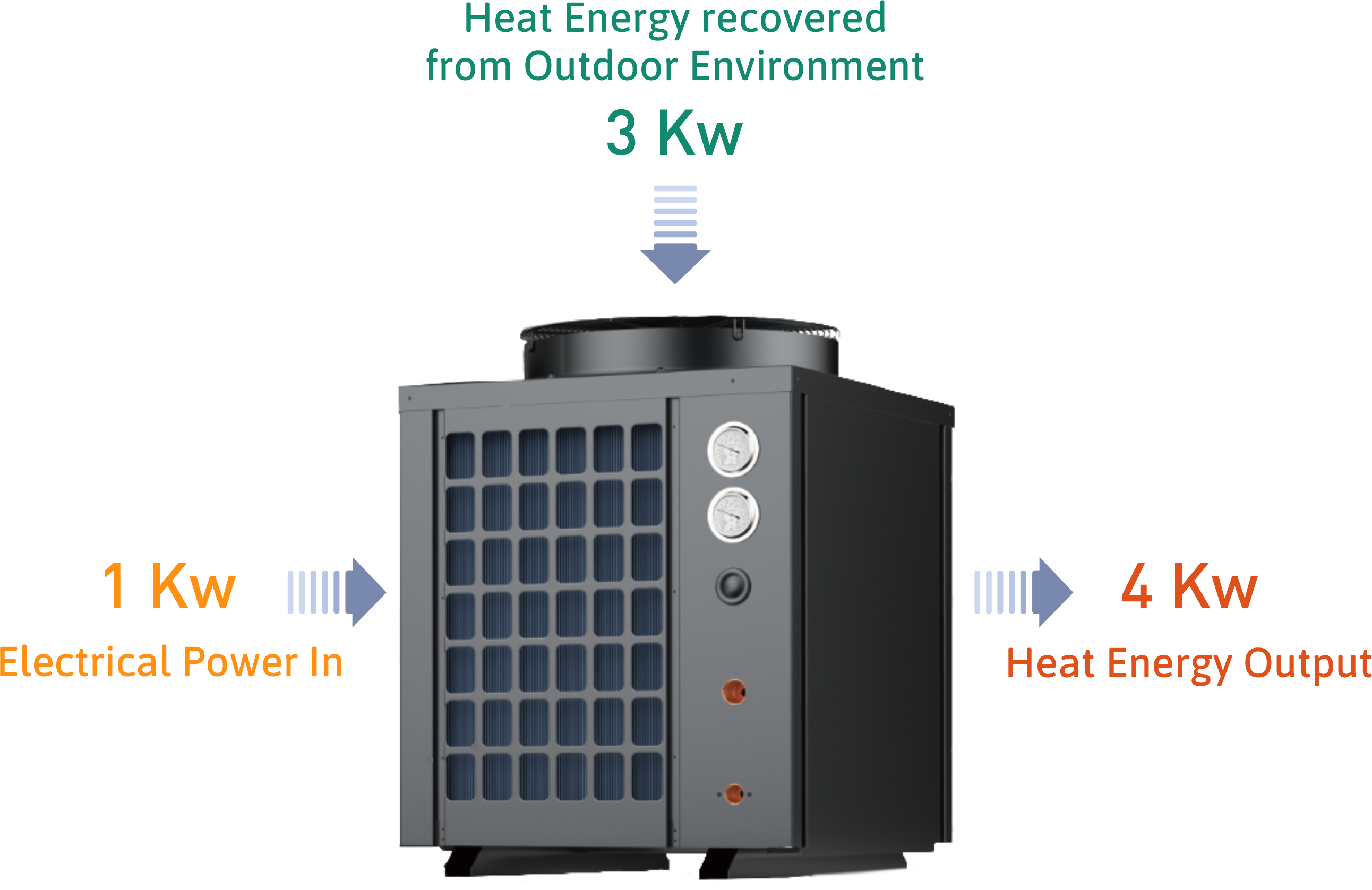 While conventional electric heaters use 1 kW of power to produce 1 kW of heat, our heat pumps can deliver up to 3 kW of hot water using just 1 kW of electricity—making them three times more efficient than traditional systems.
